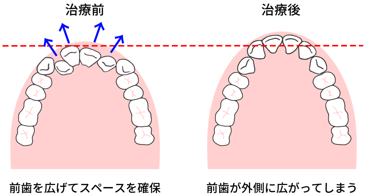この治療法では歯並びはきれいに整うかもしれませんが、治療が終わると口元が全体的に前に出てきてしまいます。